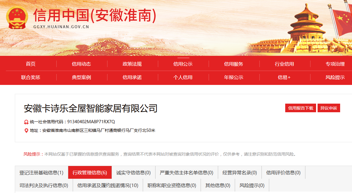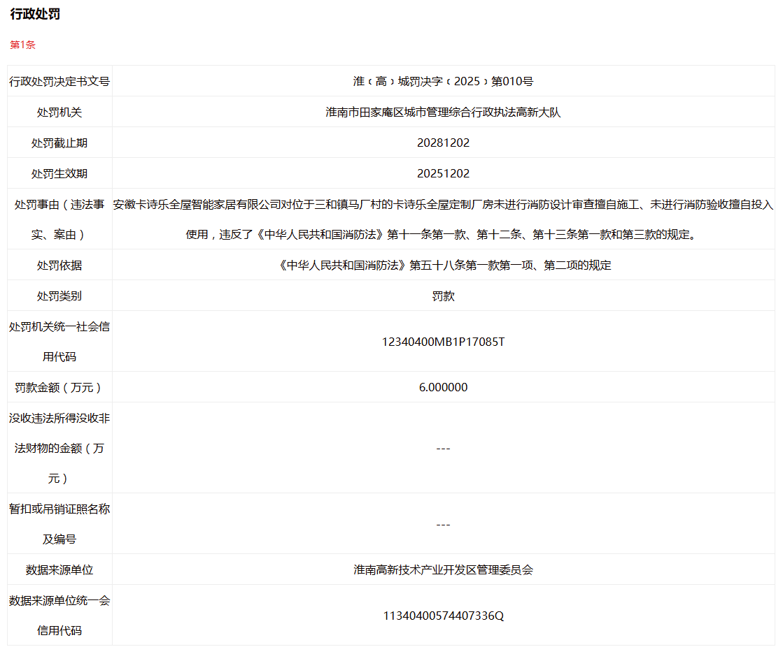近日,据“信用淮南”公开揭露行政处罚信息,因对厂房未进行消防设计审查擅自施工、未进行消防验收擅自投入使用,安徽卡诗乐全屋智能家居有限公司被处以罚款6万元。行政处罚决定书文号是淮﹝高﹞城罚决字﹝2025﹞第010号。