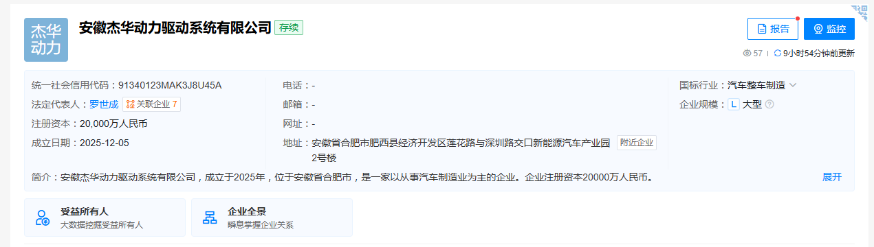 天眼查App显示,近日,安徽杰华动力驱动系统有限公司成立,法定代表人为罗世成,注册资本2亿人民币。股东信息显示,该公司由江淮汽车(600418)全资持股。经营范围包括汽车零部件及配件制造、供应链管理服务、汽车零部件研发等。