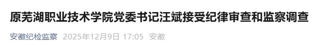 原芜湖职业技术学院党委书记汪斌涉嫌严重违纪违法,目前正接受安徽省纪委监委纪律审查和监察调查。(安徽省纪委监委)