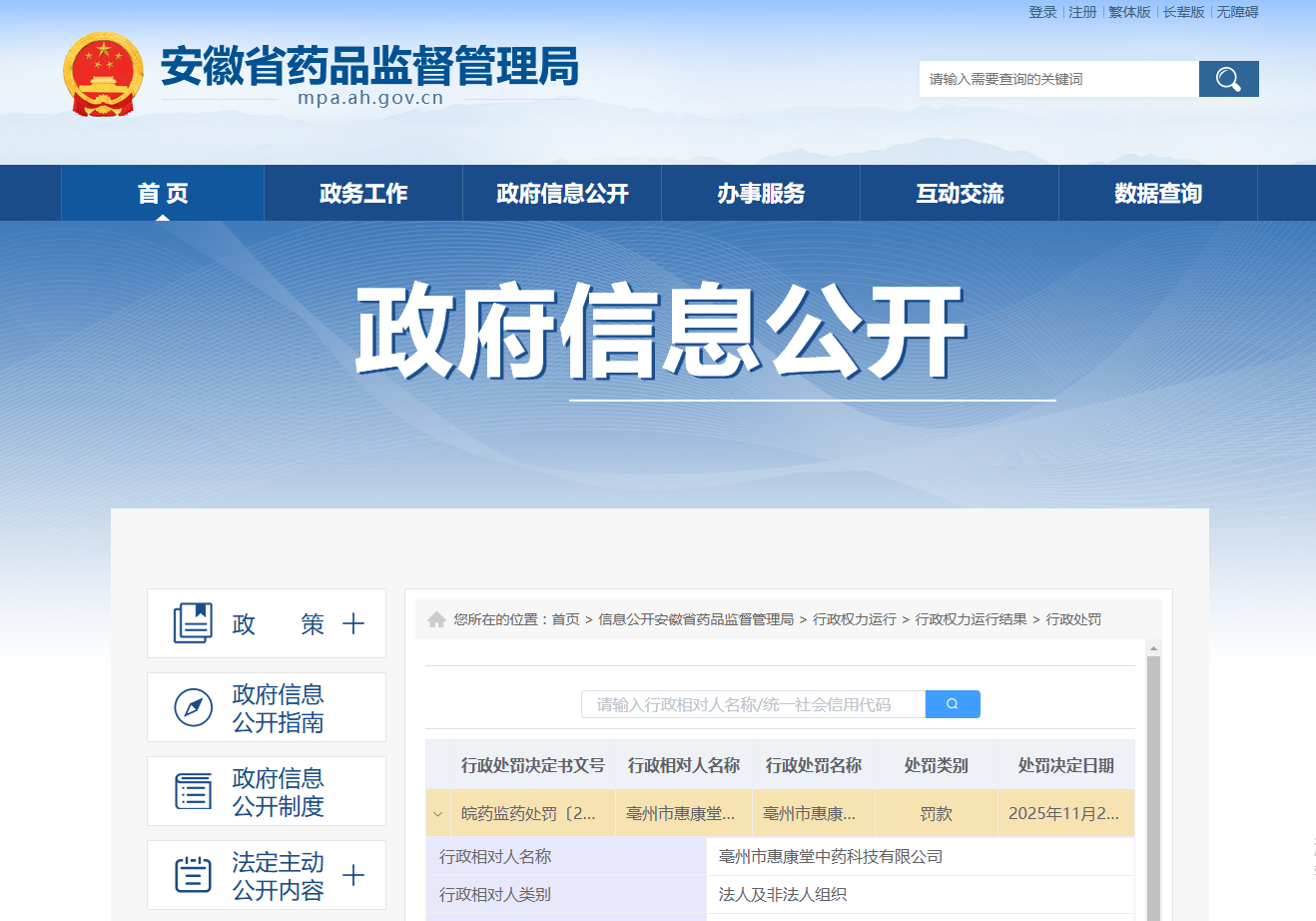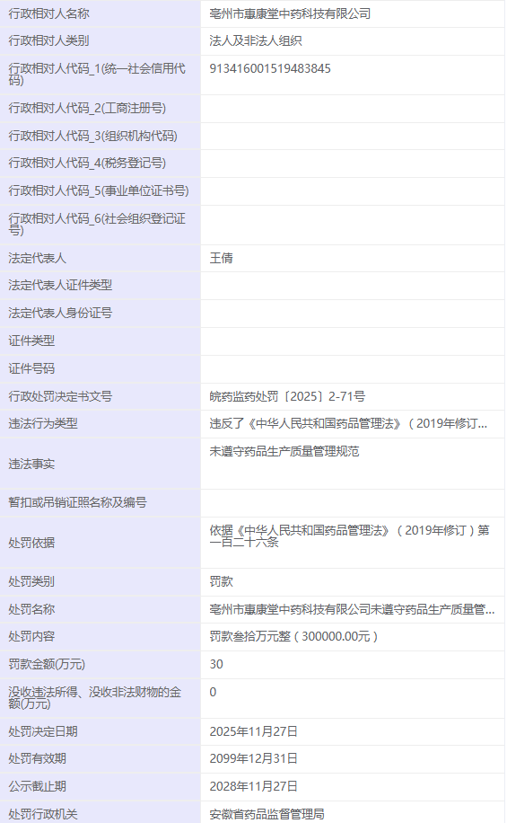 近日,据“安徽省药监局”公开披露行政处罚信息,因未遵守药品生产质量管理规范,亳州市惠康堂中药科技有限公司被处以罚款30万元。行政处罚决定书文号是皖药监药处罚〔2025〕2-71号。