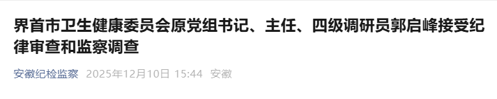 界首市卫生健康委员会原党组书记、主任、四级调研员郭启峰涉嫌严重违纪违法,目前正接受界首市纪委监委纪律审查和监察调查。(阜阳市纪委监委)