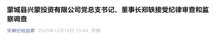 蒙城县兴蒙投资有限公司党总支书记、董事长郑轶涉嫌严重违纪违法,目前正接受蒙城县纪委监委纪律审查和监察调查。(亳州市纪委监委)