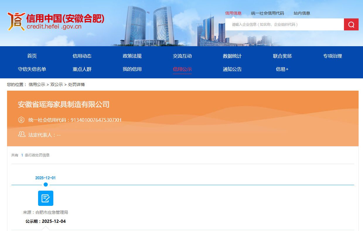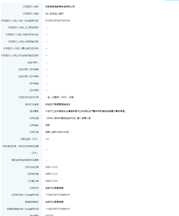近日,据“信用合肥”公开披露行政处罚信息,因未落实粉尘清理制度,安徽省瑶海家具制造有限公司被处以罚款1.8万元。行政处罚决定书文号是﹝合﹞应急罚﹝2025﹞28号。