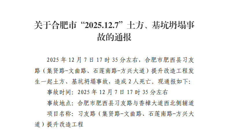 2025年12月7日17时35分左右,合肥市肥西县习友路(集贤路-文曲路、石莲南路-方兴大道)提升改造工程发生一起土方、基坑坍塌事故,造成2人死亡。现通报如下: