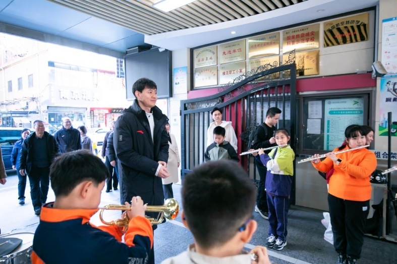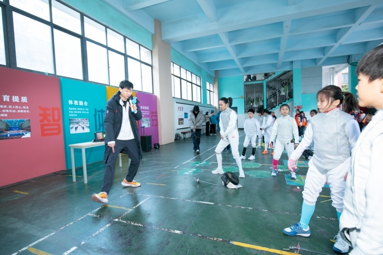 活动的高潮是击剑技术体验环节。仲满亲自持剑,为孩子们示范了基本步法和攻防动作。他耐心地俯身,指导小学员调整标准姿势,并逐一给予鼓励:“手臂要稳,脚步要活,眼睛要亮!”“不错,就是这样,坚持下去!”在他专业的指导与温暖的鼓励下,孩子们眼中闪烁着兴奋且自信的光芒。他寄语所有同学,希望他们热爱运动,享受体育带来的快乐与坚韧,在人生的赛场上“不断挑战自我,取得属于自己的满意成绩”。