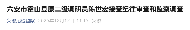 六安市霍山县原二级调研员陈世宏涉嫌严重违纪违法,目前正接受六安市纪委监委纪律审查和监察调查。(六安市纪委监委)