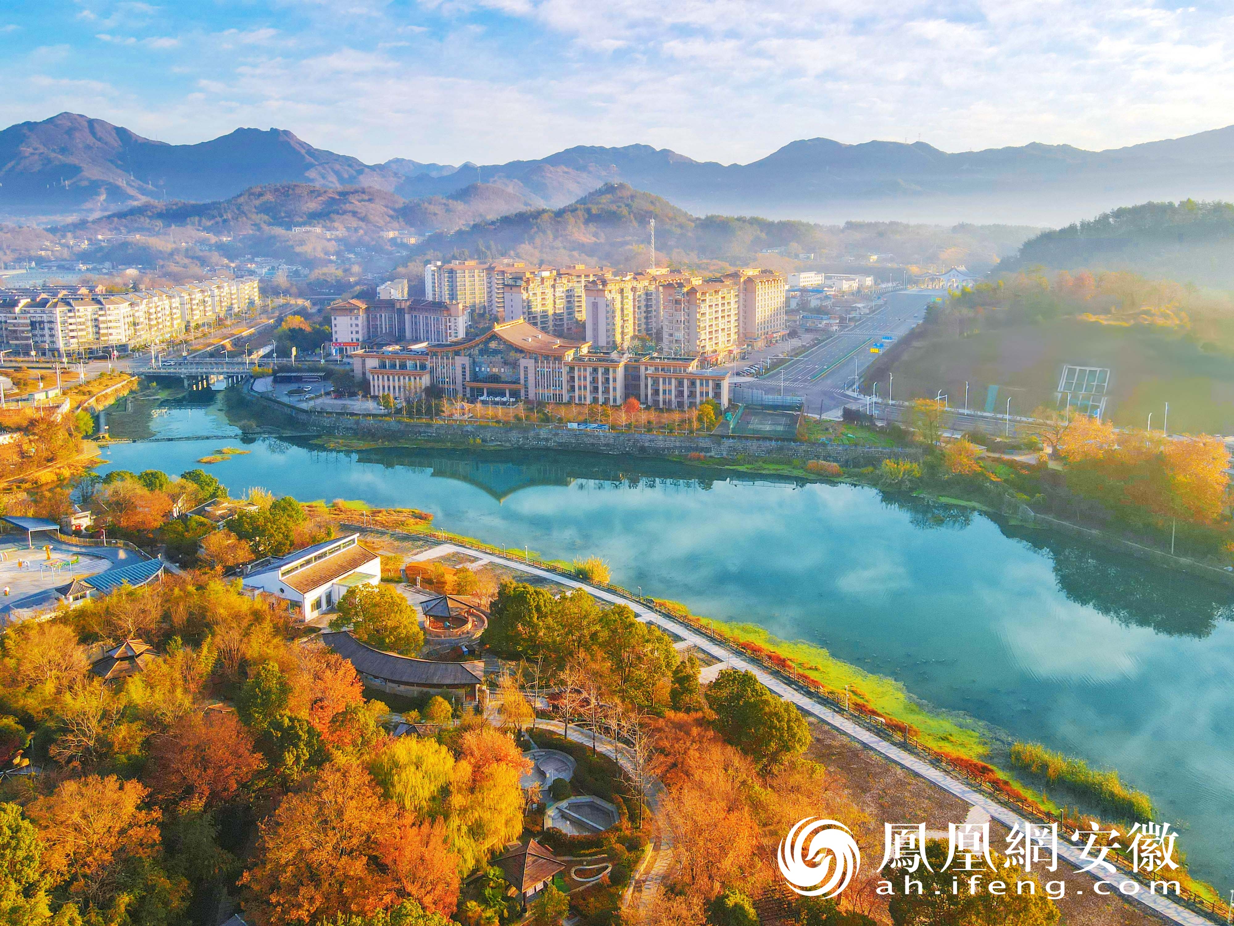 2025年11月30日,在安徽省安庆市岳西县天堂镇叶坂社区一带,冬意渐浓却秋色未褪,澄澈的河流如碧绿丝带蜿蜒穿境,两岸斑斓植被与错落民居楼宇相映成趣,绘就出一幅宜居宜业的和美乡村新画卷。(凤凰网安徽特约摄影师 吴均奇/摄)