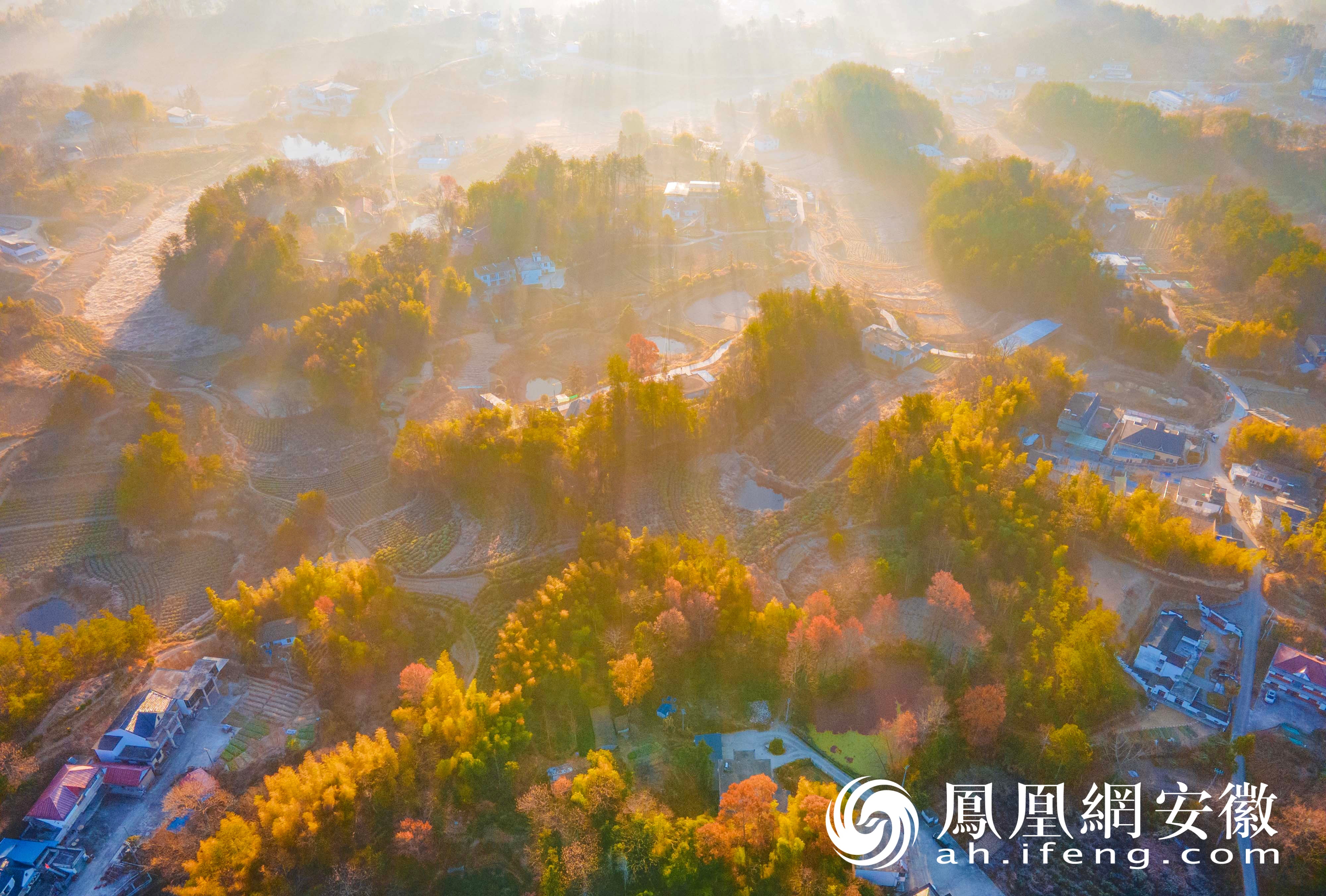 2025年12月7日,在安徽省安庆市岳西县温泉镇牌坊村在地图中查看一带,薄雾轻笼,霞光如金,民居、田园、山峦、道路交相辉映,构成一幅大别山腹地和美乡村新画卷。(凤凰网安徽特约摄影师 吴均奇/摄)