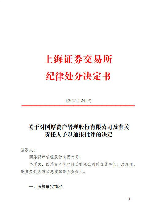 近日,上海证券交易所公告称,因未及时披露24.56亿元债务逾期,国厚资产管理股份有限公司(以下简称“国厚资产”)及有关责任人被通报批评。