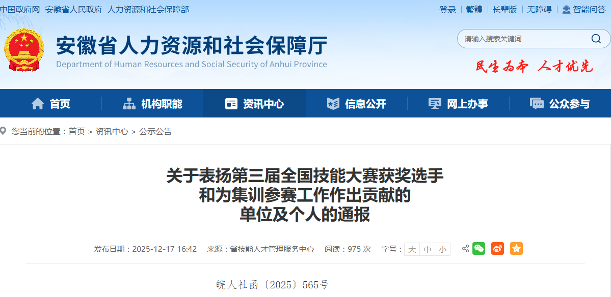 2025年9月19日至23日,中华人民共和国第三届职业技能大赛在河南省郑州市成功举办,我省组织116名选手参加了全部106个赛项比赛,获得5项金牌、2项银牌、3项铜牌、49项优胜奖,安徽代表团获得突出贡献奖,根据《安徽省人民政府关于印发支持技工强省建设若干政策的通知》(皖政〔2022〕72号)和安徽省人力资源和社会保障厅、安徽省教育厅、安徽省财政厅《关于印发支持技工强省建设若干政策实施细则的通知》(皖人社秘〔2023〕118号)有关规定,以及人力资源社会保障部《关于公布中华人民共和国第三届职业技能大赛获奖选手名单的通知》精神,经研究决定: