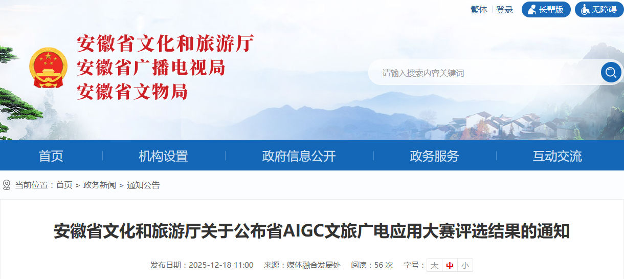 为深入贯彻落实党的二十大及二十届历次全会精神、习近平总书记考察安徽重要讲话精神,推动AIGC技术在文旅广电内容创作、节目制作、智能传播等领域的创新实践与深度应用,探索文旅与广电双向赋能路径,创新安徽文旅资源推广模式,省文化和旅游厅组织开展AIGC文旅广电应用大赛。本次大赛共评选出一等奖2名、二等奖6名、三等奖10名;单项奖设最佳创意奖、最佳叙事奖、最佳人气奖、最佳技术应用奖各3名;优秀组织奖10个。现将评审结果予以公布。