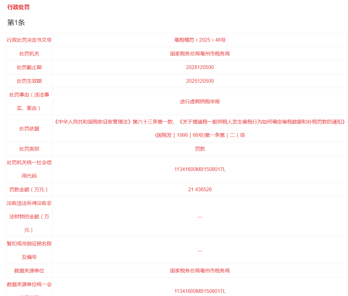 近日,据“信用亳州”公开披露行政处罚信息,因进行虚假纳税申报,蒙城县盛航商贸有限公司被处以罚款21.436526万元。行政处罚决定书文号是亳税稽罚﹝2025﹞48号。