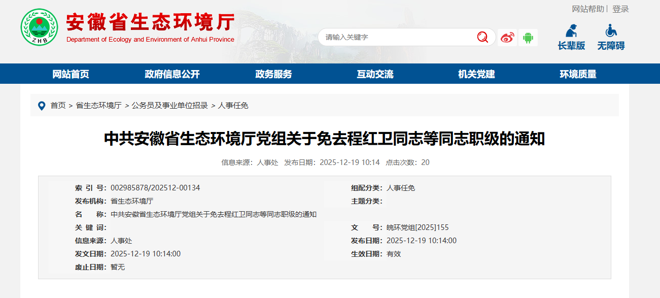 2025年12月19日,安徽省生态环境厅发布《中共安徽省生态环境厅党组关于免去程红卫同志四级调研员职级的通知》,程红卫等5名同志免去职级,按有关政策规定办理退休事宜。