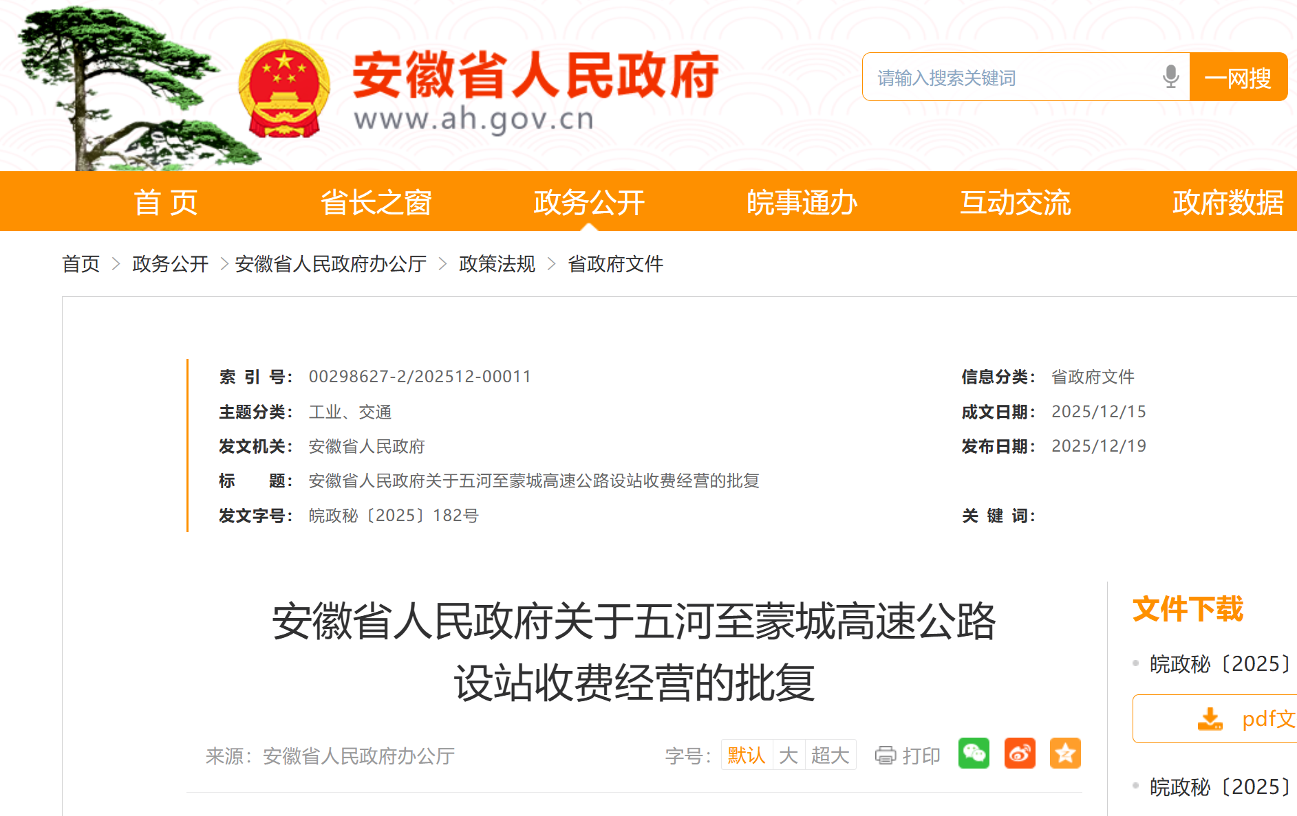 《关于五河至蒙城高速公路设站收费经营的请示》(皖交路〔2025〕200号)悉。经研究,现批复如下: