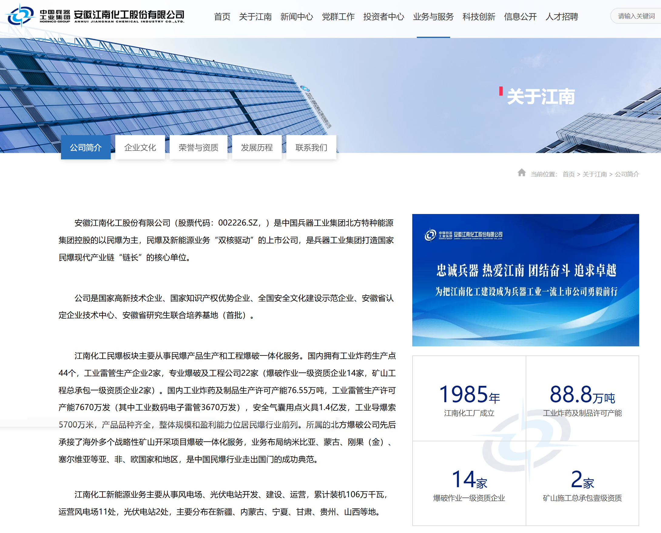 据公司官网显示,安徽江南化工股份有限公司(股票代码:002226.SZ,)