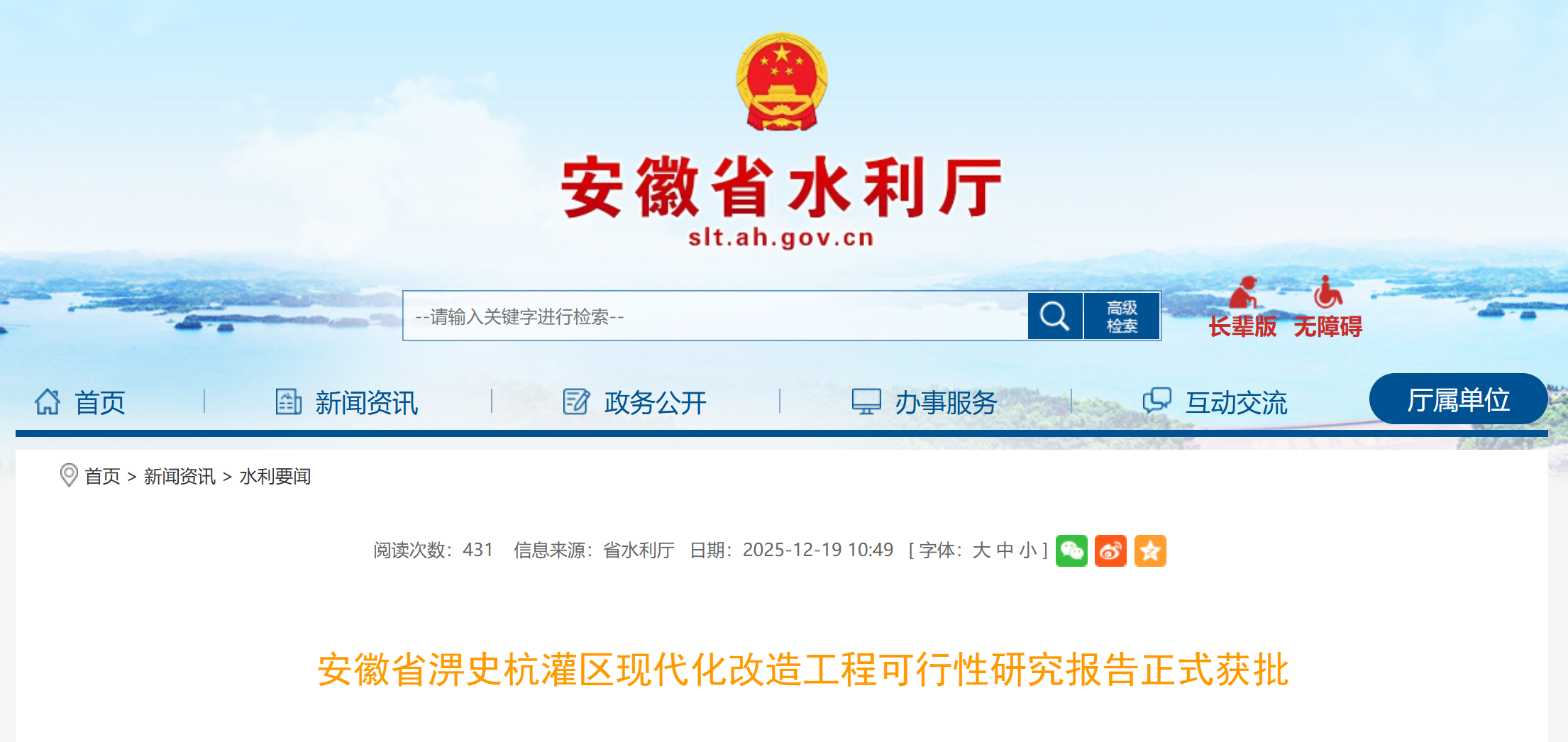 近日,安徽省水利厅发布《安徽省淠史杭灌区现代化改造工程可行性研究报告正式获批》,内容如下: