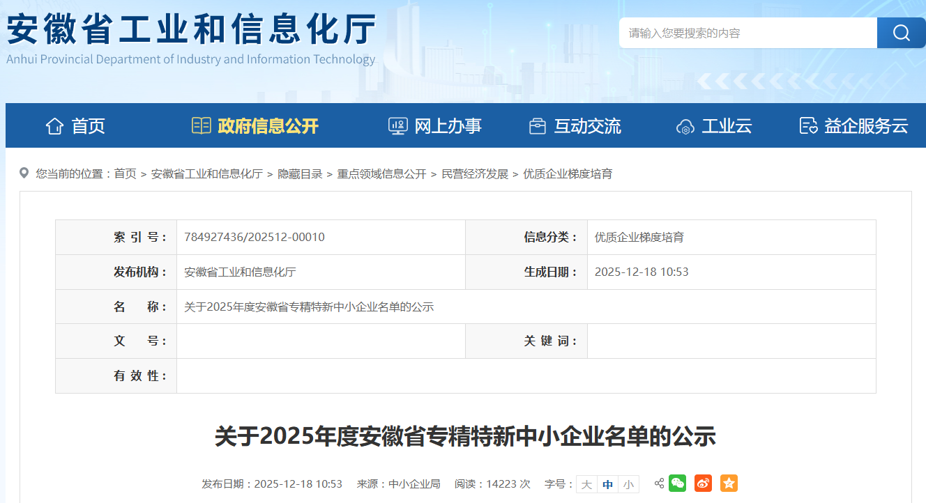 根据《安徽省优质中小企业梯度培育管理实施细则》,我厅组织开展了2025年专精特新中小企业培育认定工作,已完成各地审核推荐、第三方审核等程序,现将通过的企业名单予以公示。