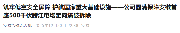 作为本次爆破作业的低空安全保障专项服务商,省通航无人机公司高度重视,提前制定专项保障方案,派出专业技术团队,以新质生产力为核心支撑,圆满完成爆破现场低空安全防护保障任务,为国家电网重大基础设施筑牢空中安全屏障。