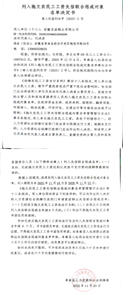 公开处罚信息显示,经查,安徽百益鞋业有限公司存在拖欠:马宗强、李全生等69名工人工资合计:1087915元,情节严重。2025年11月4日,阜南县人社局依法向你送达《列入拖欠农民工工资失信联合惩戒对象名单事先告知书》(南人社监列告字(2025)2号),安徽百益鞋业有限公司在规定期限内未向草南县人社局提出异议。
