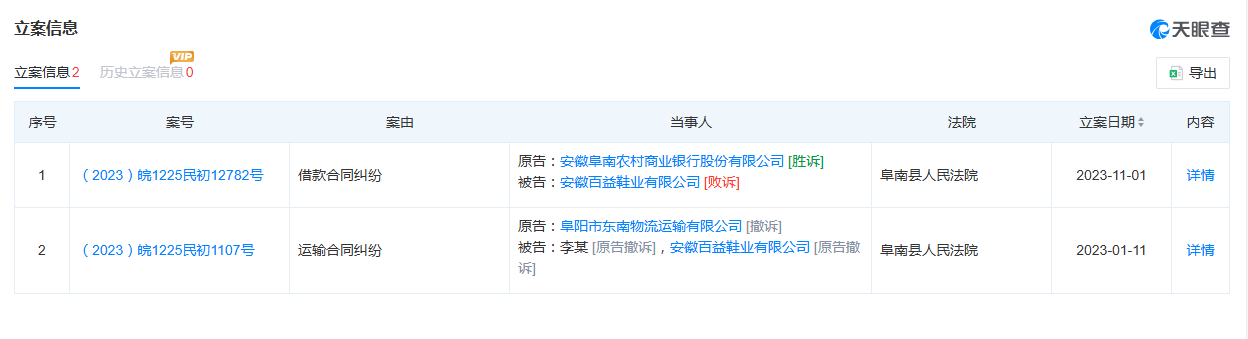 此外,安徽百益鞋业有限公司因借款合同纠纷,被安徽阜南农村商业银行股份有限公司告上法庭。