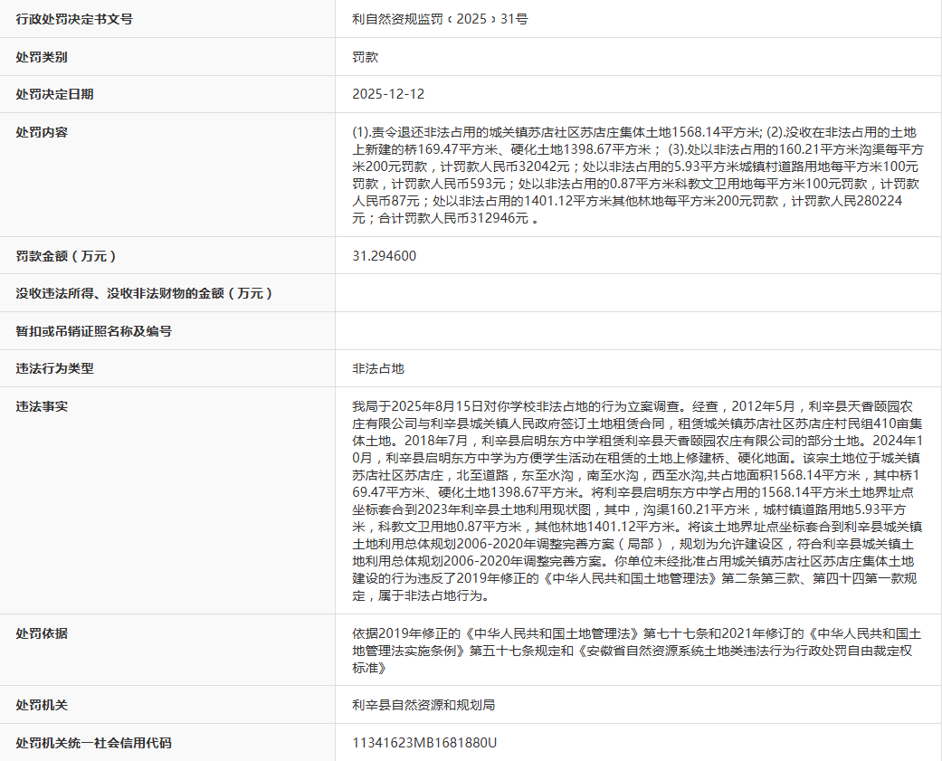 近日,据“信用安徽”披露行政处罚信息,因非法占地,利辛县启明东方中学被处以罚款31.2946万元。行政处罚决定书文号是利自然资规监罚﹝2025﹞31号。