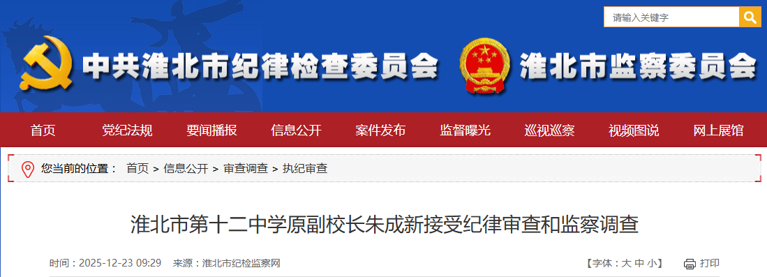淮北市第十二中学原副校长朱成新涉嫌严重违纪违法,经淮北市纪委监委指定管辖,目前正接受淮北市烈山区纪委监委纪律审查和监察调查。(淮北市烈山区纪委监委)
