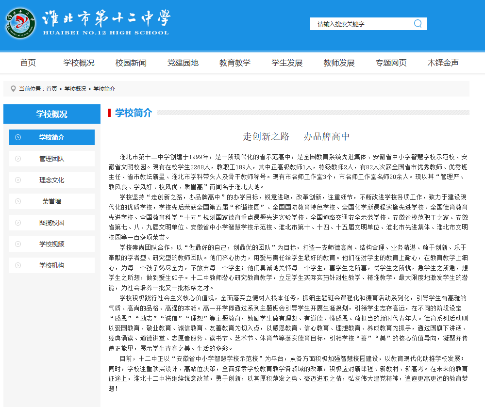 官网信息显示,淮北市第十二中学创建于1999年,是一所现代化的省示范高中,是全国教育系统先进集体、安徽省中小学智慧学校示范校、安徽省文明校园。现有在校学生2268人,教职工189人,其中正高级教师1人,特级教师2人,有82人次获全国省市优秀教师、优秀班主任、省市教坛新星、淮北市学科带头人及骨干教师称号。现有市名师工作室3个,市名师工作室名师20余人。