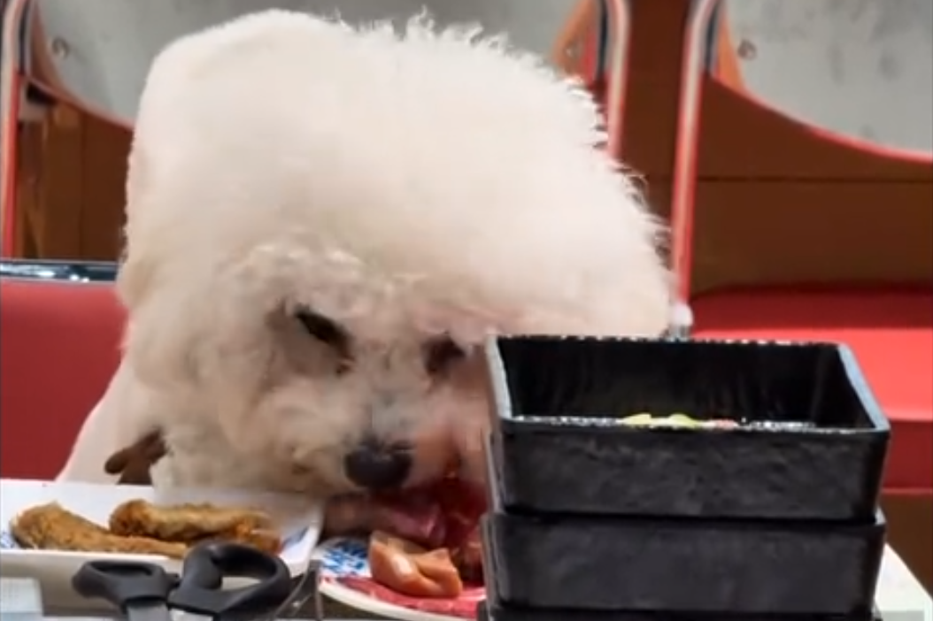 12月22日,安徽合肥一家烤肉店有宠物狗上桌吃饭,餐桌上的餐盘里放有食物,宠物狗在不断啃食生肉。