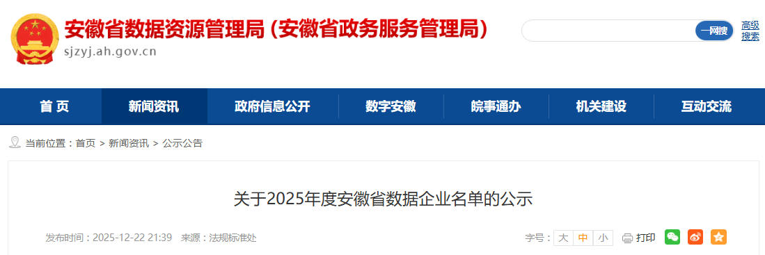 根据《安徽省数据企业培育认定实施细则》(皖数资〔2025〕37号)和《关于组织开展2025年度安徽省数据企业培育认定和加强规范管理有关工作的通知》,经企业申报、各市初审推荐、专家评审、审查认定等程序,现将通过的企业予以公示,公示时间为5个工作日(2025年12月23日至12月29日)。