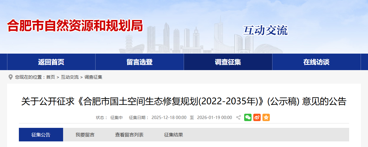 为深入贯彻习近平生态文明思想,切实衔接《安徽省国土空间生态修复规划(2021-2035年)》《合肥市国土空间总体规划(2021-2035年)》, 依据《中华人民共和国城乡规划法》、安徽省自然资源厅《国土空间规划公示公开规定(暂行)》等要求,现将《合肥市国土空间生态修复规划(2022-2035年)》(公示稿)予以公示,广泛征求社会各界及公众意见,公示时间自2025年12月18日起至2026年1月18日止,可通过以下四种方式提出意见: