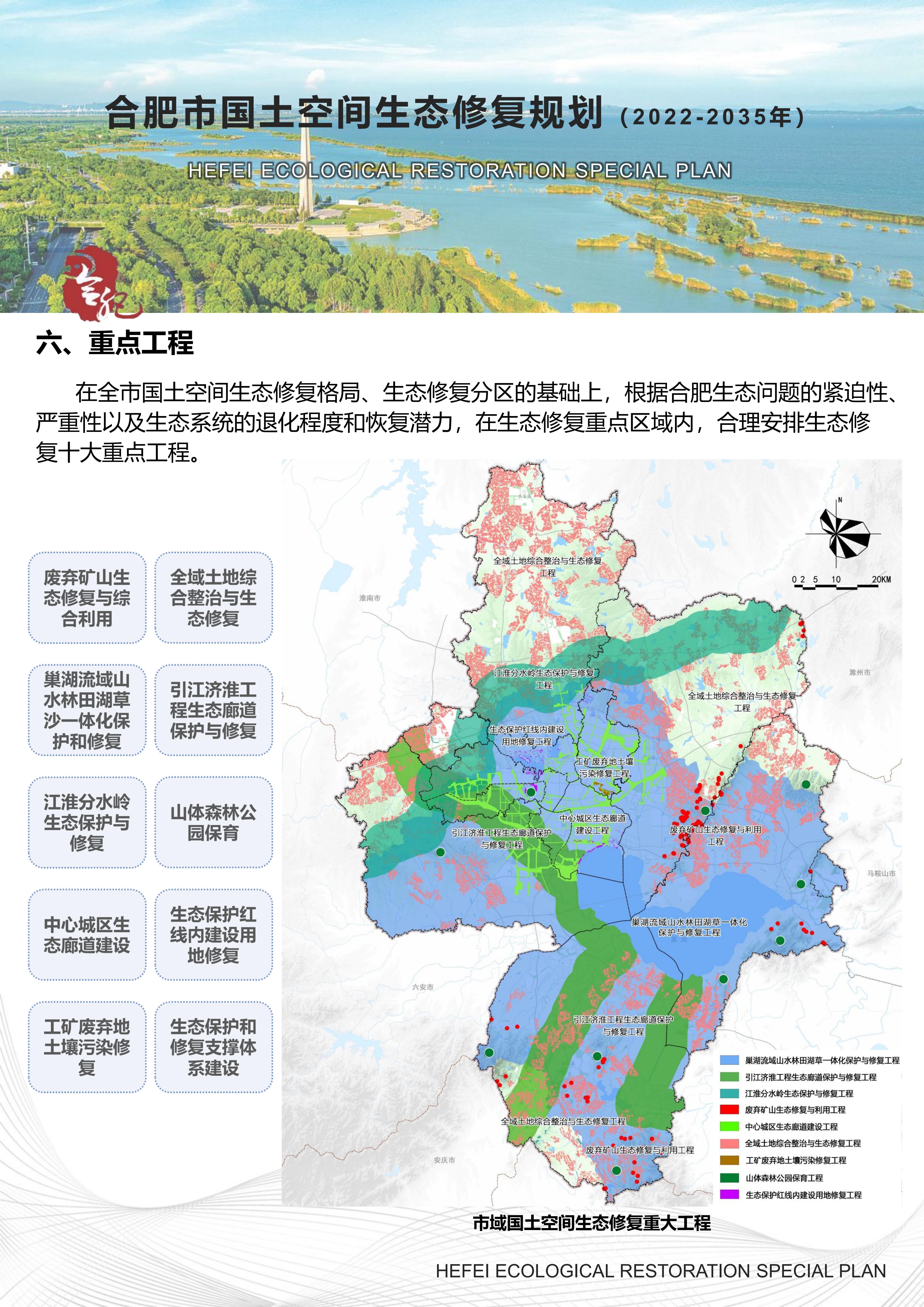 在全市国土空间生态修复格局、生态修复分区的基础上,根据合肥生态问题的紧迫性、严重性以及生态系统的退化程度和恢复潜力,在生态修复重点区域内,合理安排生态修复十大重点工程。具体包括:废弃矿山生态修复与利用工程、全域土地综合整治与生态修复工程、巢湖流域山水林田湖草沙一体化保护与修复工程、引江济淮生态廊道保护与修复工程、江淮分水岭生态保护与修复工程、山体森林公园保育工程、中心城区生态廊道建设工程、生态保护红线内建设用地修复工程、工矿废弃地土壤污染修复工程和生态保护和修复支撑体系建设工程。