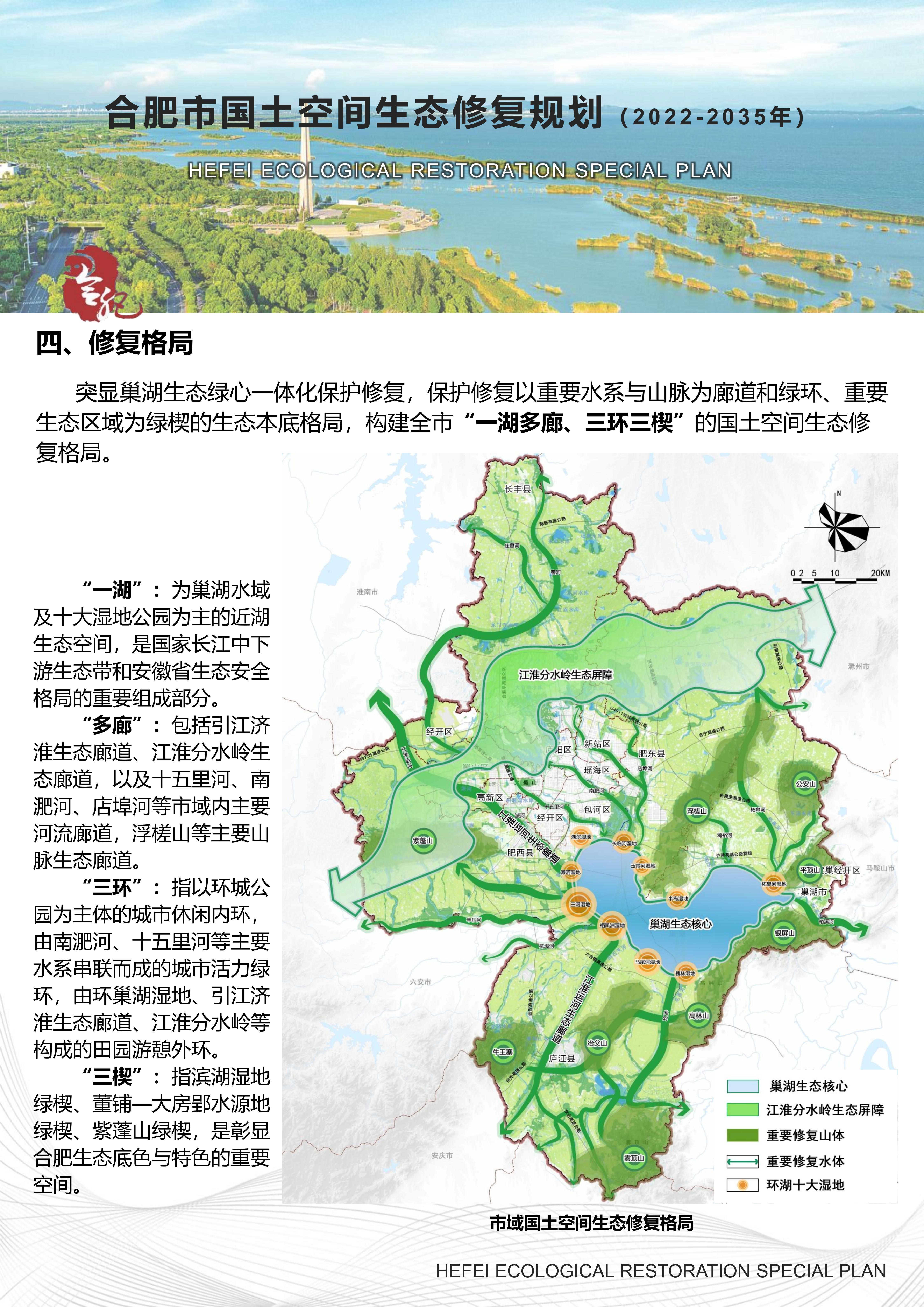 总体布局:突显巢湖生态绿心一体化保护修复,保护修复以重要水系与山脉为廊道和绿环、重要生态区域为绿楔的生态本底格局,构建全市“一湖多廊、三环三楔”的国土空间生态修复格局。