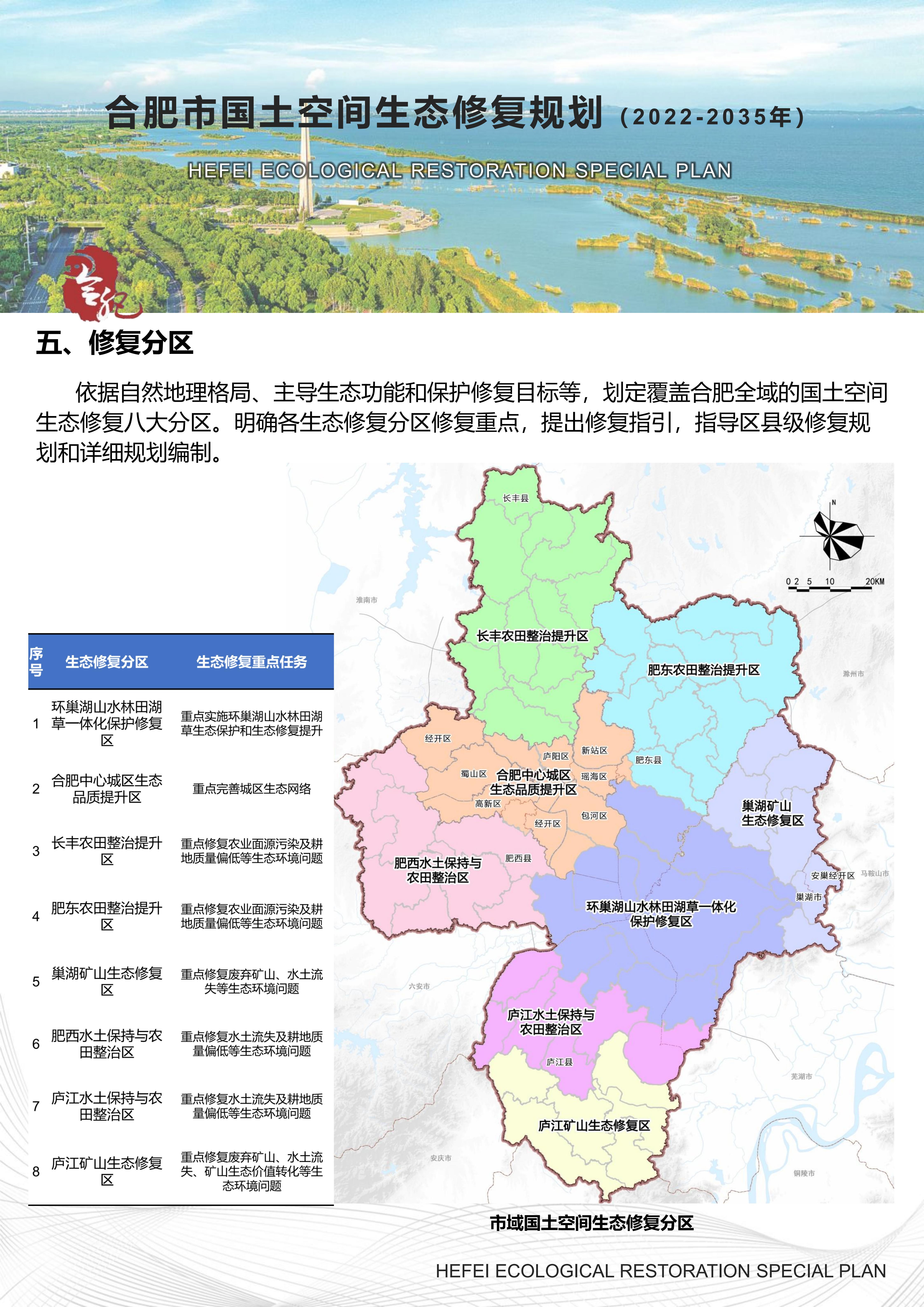 修复分区:依据自然地理格局、主导生态功能和保护修复目标等,划定覆盖合肥全域的国土空间生态修复八大分区。明确各生态修复分区修复重点,提出修复指引,指导区县级修复规划和详细规划编制。具体包括:环巢湖山水林田湖草沙一体化保护修复区、合肥中心城区生态品质提升区、肥东农田整治提升区、肥西水土保持与农田整治区、长丰农田整治提升区、巢湖矿山生态修复区、庐江水土保持与农田整治区和庐江矿山生态修复区。