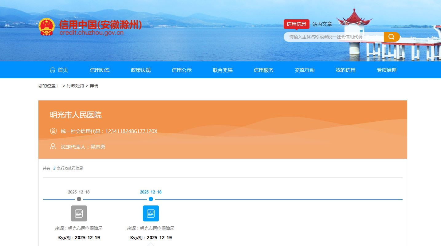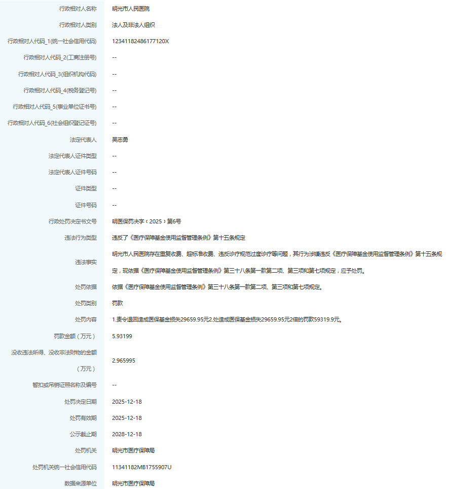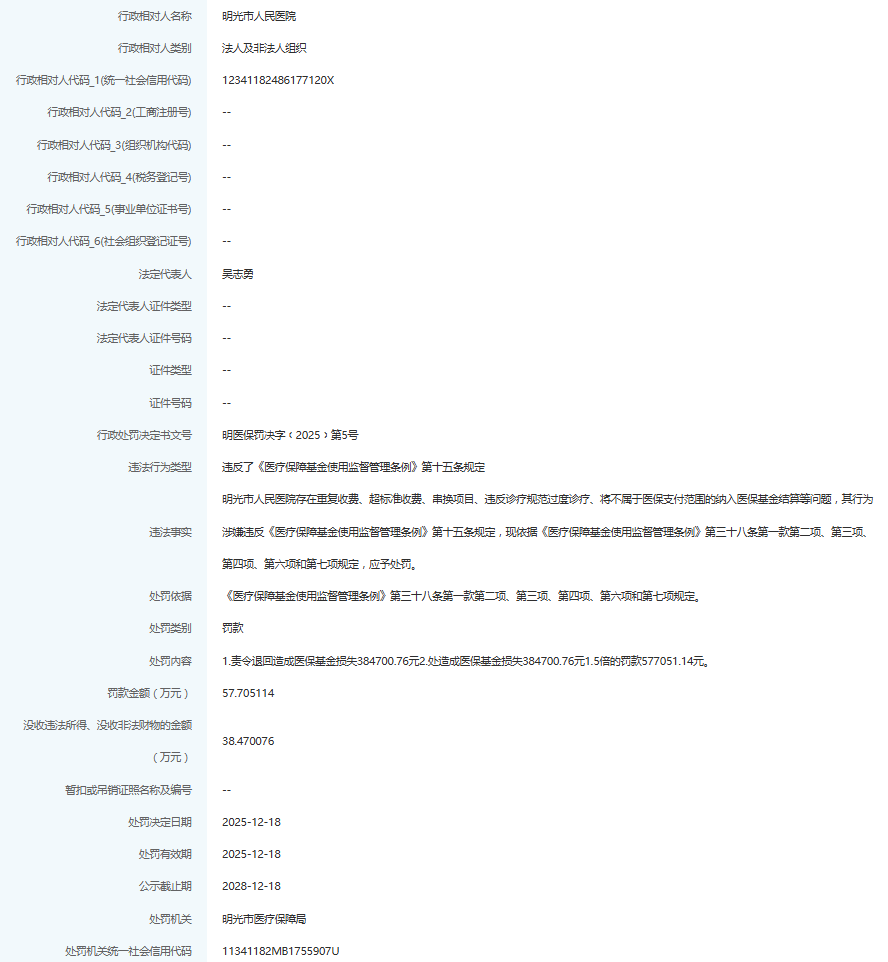 12月19日,据“信用滁州”公开披露行政处罚信息,因重复收费、超标准收费、违反诊疗规范过度诊疗等问题,明光市人民医院被明光市医疗保障局处罚两次,被罚没金额合计超105万元。行政处罚决定书文号分别是明医保罚决字﹝2025﹞第5号、明医保罚决字﹝2025﹞第6号。