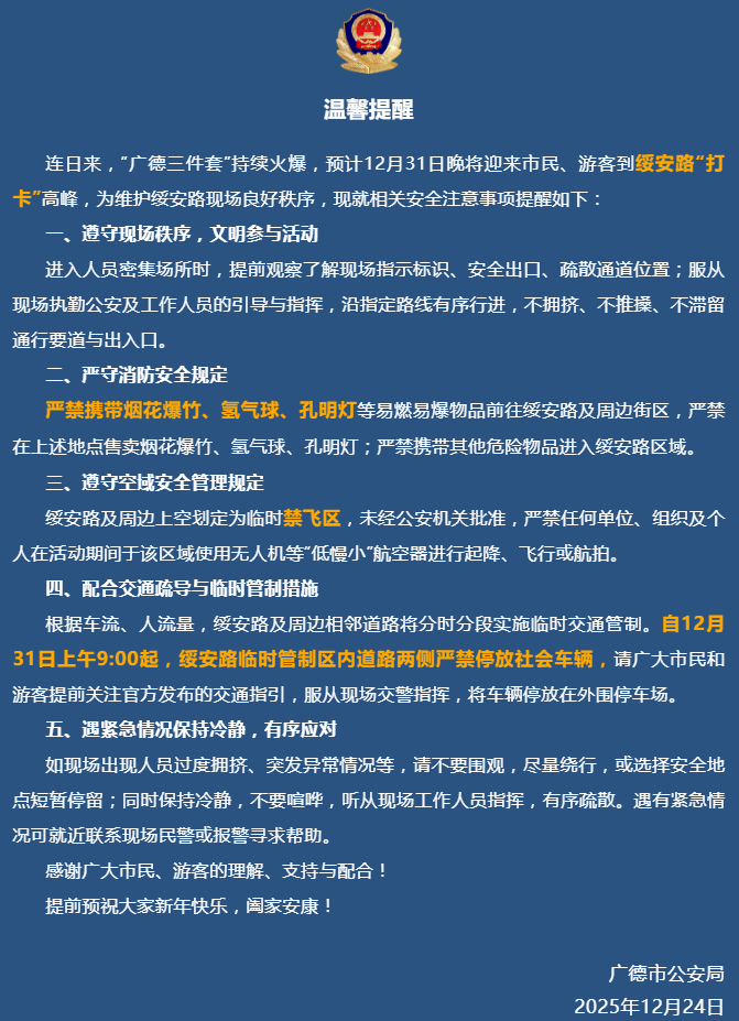 连日来,“广德三件套”持续火爆,预计12月31日晚将迎来市民、游客到绥安路“打卡”高峰,为维护绥安路现场良好秩序,现就相关安全注意事项提醒如下: