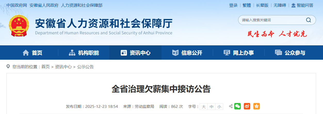 根据工作安排,省就业促进和劳动保护工作领导小组办公室决定于2026年春节前在全省开展3次治理拖欠农民工工资问题集中接访活动。集中接访时间分别为2025年12月26日,2026年1月16日、2月6日,每次集中接访下午2点30分开始,持续半天。因拖欠农民工工资投诉的,可于接访日下午到当地集中接访点反映。有关信息见附件。