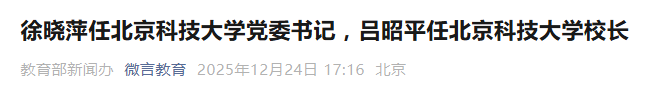 12月24日,教育部党组在北京科技大学宣布了有关任免决定,徐晓萍同志任北京科技大学党委书记,吕昭平同志任北京科技大学校长、党委副书记;武贵龙同志不再担任北京科技大学党委书记职务,杨仁树同志不再担任北京科技大学校长、党委副书记职务。教育部党组成员、副部长、总督学王嘉毅出席会议并讲话。北京市委教育工委有关负责同志出席会议并讲话,教育部人事司主要负责同志出席会议。