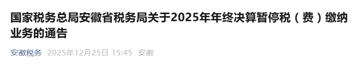 按照国务院办公厅2026年元旦节假日安排,为配合人民银行、商业银行共同做好2025年全省税费收入年终决算工作,国家税务总局安徽省税务局将暂停各项税(费)缴纳业务。具体通告如下: