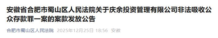 被告人庆余投资管理有限公司非法吸收公众存款罪一案,安徽省合肥市蜀山区人民法院对刑事判决涉财产部分立案执行后,依法有序推进资产处置、资金归集、信息核实等重点工作。为维护集资参与人的合法权益,现依据生效刑事裁判文书和集资参与人信息对执行款进行发放工作,具体事项公告如下: