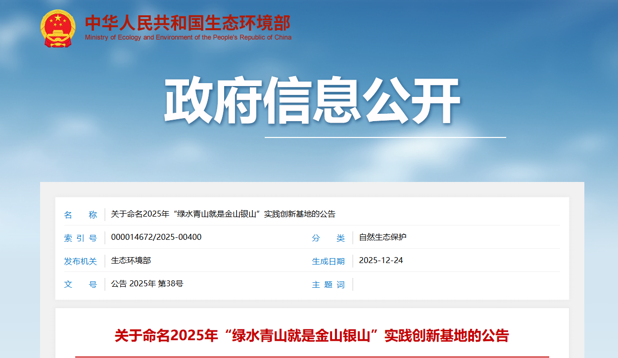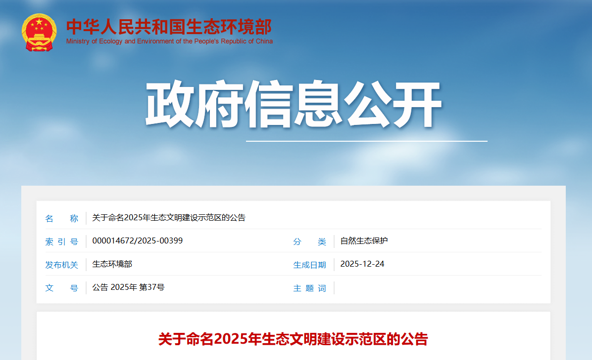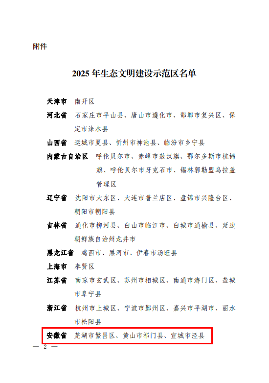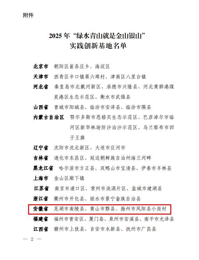 近日,生态环境部发布2025年“绿水青山就是金山银山”实践创新基地和生态文明建设示范区名单。其中,安徽省芜湖市繁昌区、黄山市祁门县、宣城市泾县获评2025年生态文明建设示范区。芜湖市南陵县、黄山市黟县、滁州市凤阳县小岗村获评2025年“绿水青山就是金山银山”实践创新基地。