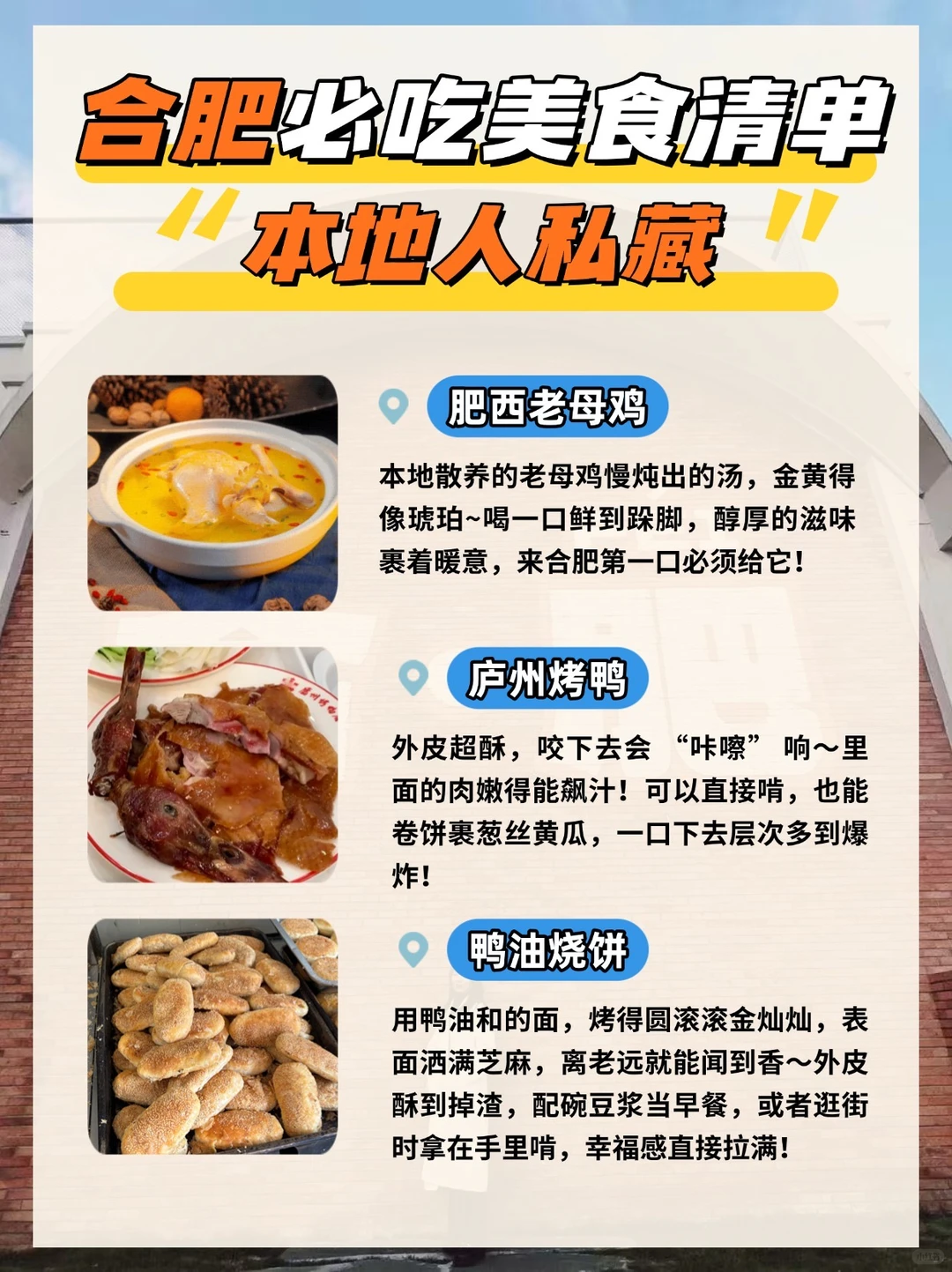 庐州烤鸭:外皮超酥,咬下去会“咔嚓”响~里面的肉嫩得能飙汁!可以直接啃,也能卷饼裹葱丝黄瓜,一口层次多到爆炸!