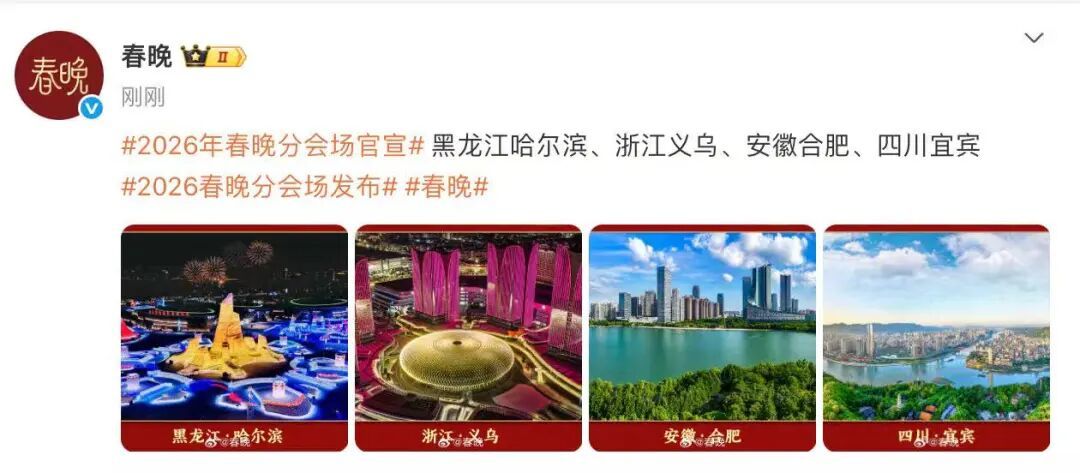 据央视新闻,12月28日,中央广播电视总台《2026年春节联欢晚会》分会场发布活动举行。发布活动上官宣了2026年春晚分会场:哈尔滨、义乌、合肥、宜宾。