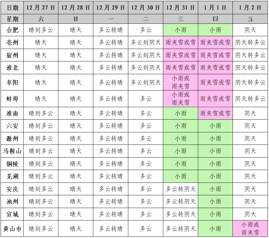 安徽省气象台预报,30日前全省以晴到多云天气为主。31日至2026年1月2日我省有一次降水过程。