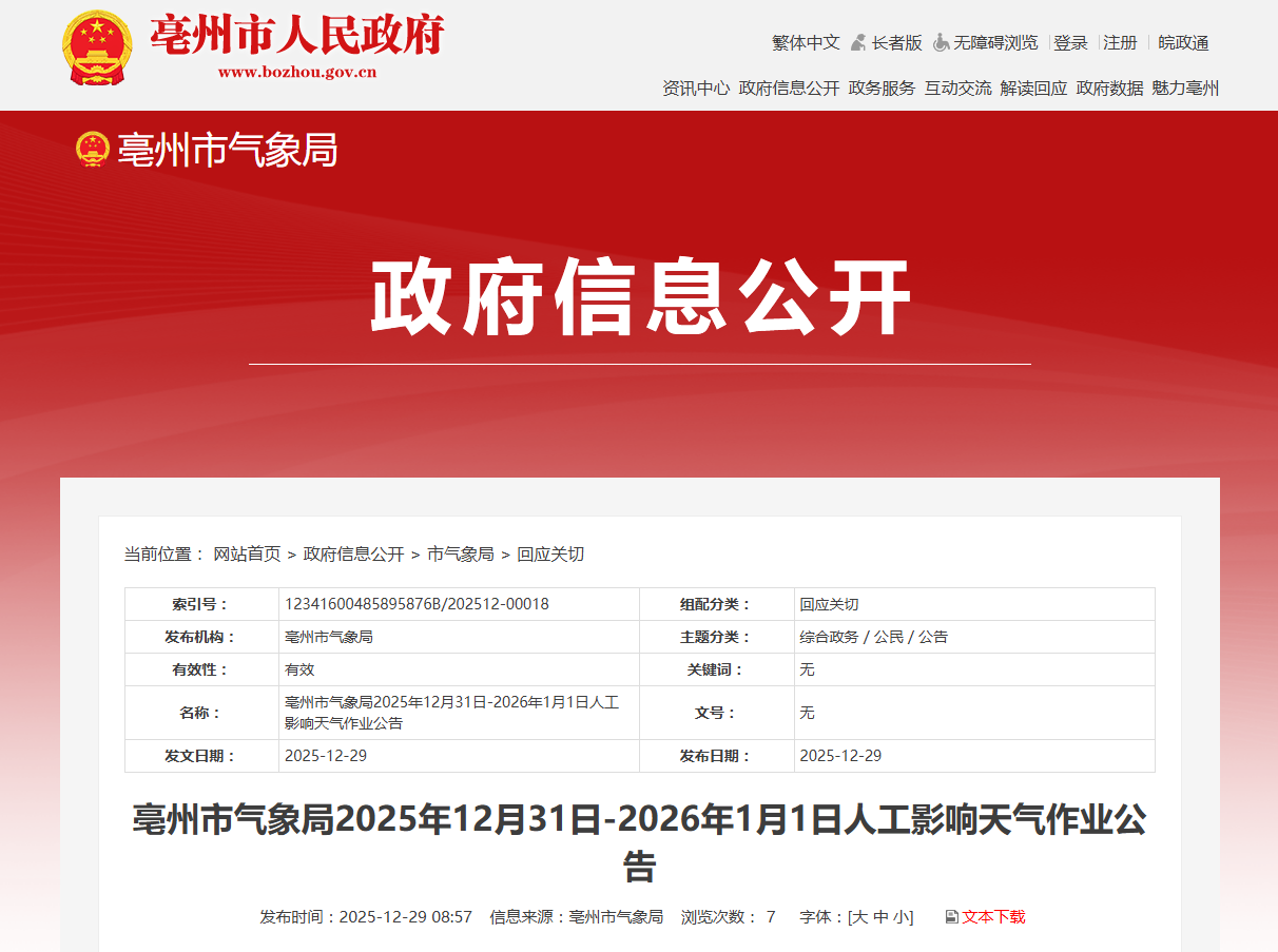 一、增雨作业起止时间:2025年12月31日0时至2026年1月1日24时之间适时择机实施。本次作业期间各作业单位会随时关注天气变化,根据当地、当时实际作业需求和天气状况可
