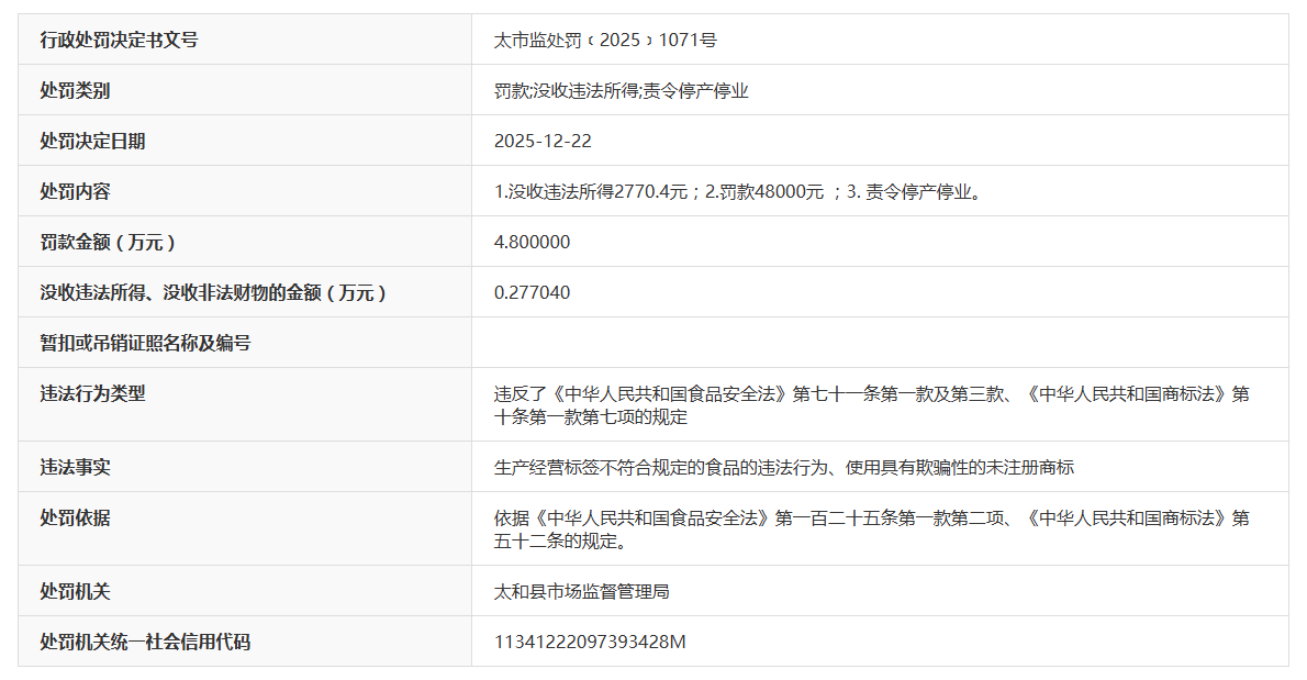 对此,依据《中华人民共和国食品安全法》第一百二十五条第一款第二项、《中华人民共和国商标法》第五十二条的规定,太和县市场监督管理局作出以下行政处罚决定:1.没收违法所得2770.4元;2.罚款48000元;3.责令停产停业。