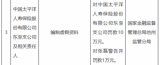 近日,据“国家金融监督管理总局安徽监管局”公开披露行政处罚信息,因编制虚假资料,国家金融监督管理总局池州监管分局对中国太平洋人寿保险股份有限公司东至支公司罚款10万元,对相关责任人张磊警告并罚款1万元。