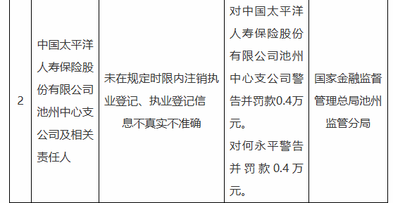 近日,据“国家金融监督管理总局安徽监管局”公开披露行政处罚信息,因未在规定时限内注销执业登记、执业登记信息不真实不准确,国家金融监督管理总局池州监管分局对中国太平洋人寿保险股份有限公司池州中心支公司警告并罚款0.4万元,对相关责任人何永平警告并罚款0.4万元。