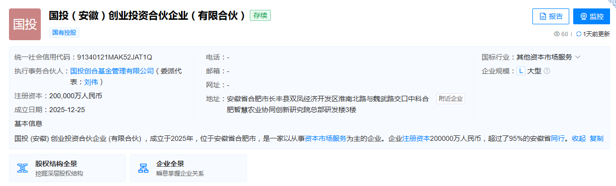 天眼查信息显示,近日,国投(安徽)创业投资合伙企业(有限合伙)成立,出资额20亿元,经营范围包含:创业投资(限投资未上市企业)。该企业由国家开发投资集团有限公司、安徽省中小企业发展二期基金有限公司等共同出资。