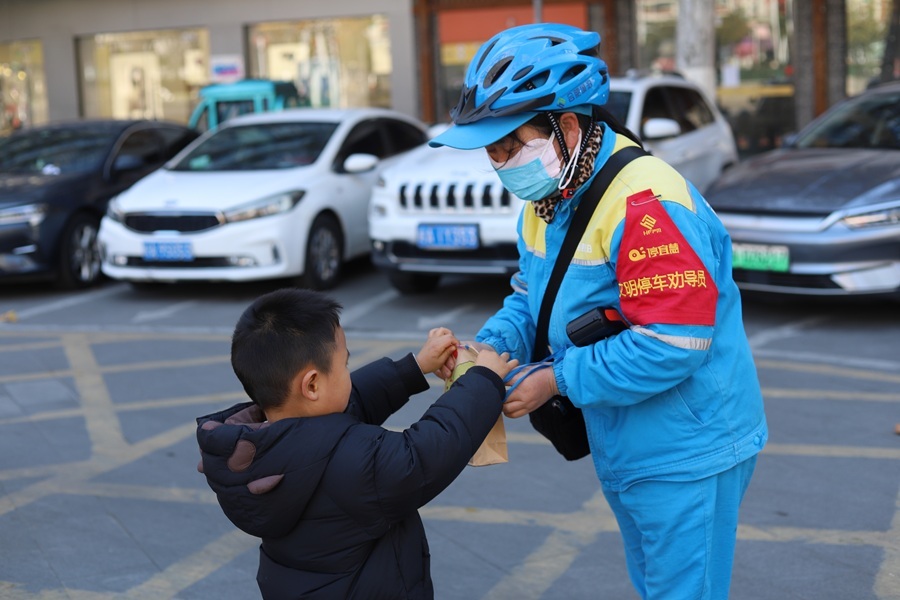 大一班、中一班、小五班幼儿开展“爱心传递”献暖活动。幼儿共同清点蔬菜义卖善款、商讨采购清单,挑选保暖手套、护手霜等冬季实用物资,并亲手绘制爱心卡片。在社区,幼儿向执勤交警、环卫工人送上暖心礼包,用稚嫩的声音表达敬意,直观感受一线工作者的辛劳。