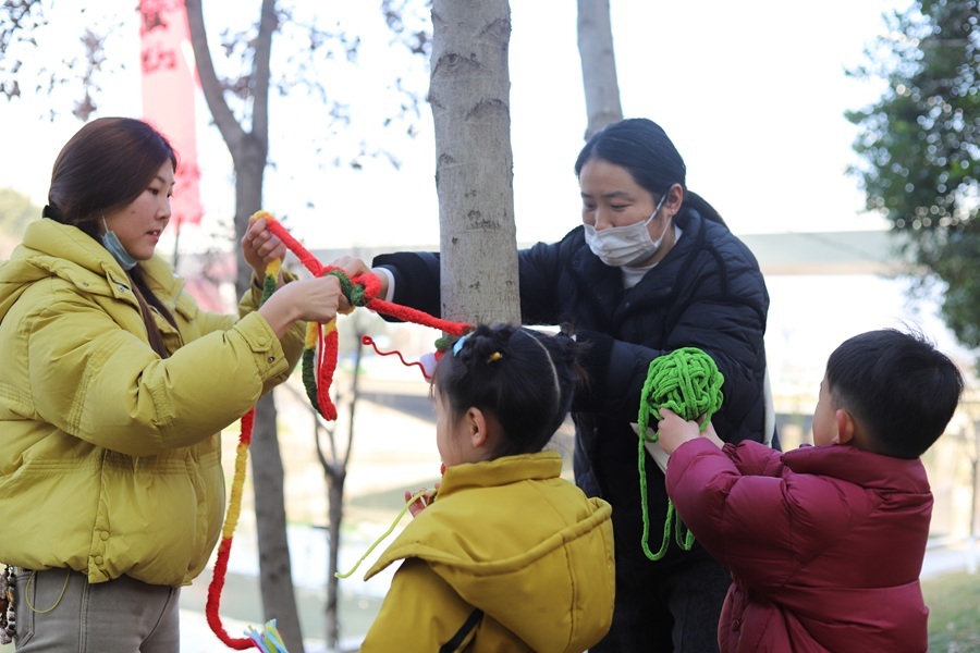 此外,幼儿园还开展“我为小树穿冬衣”活动。前期教师通过《冬天里的树》主题活动,为幼儿铺垫树木过冬的相关知识。活动现场,孩子们在教师和家长志愿者的指导下,用毛线、稻草绳为树木缠绕保温层,从递材料到尝试缠绕,每个孩子都积极参与,在动手实践中增强环保意识与社区归属感。